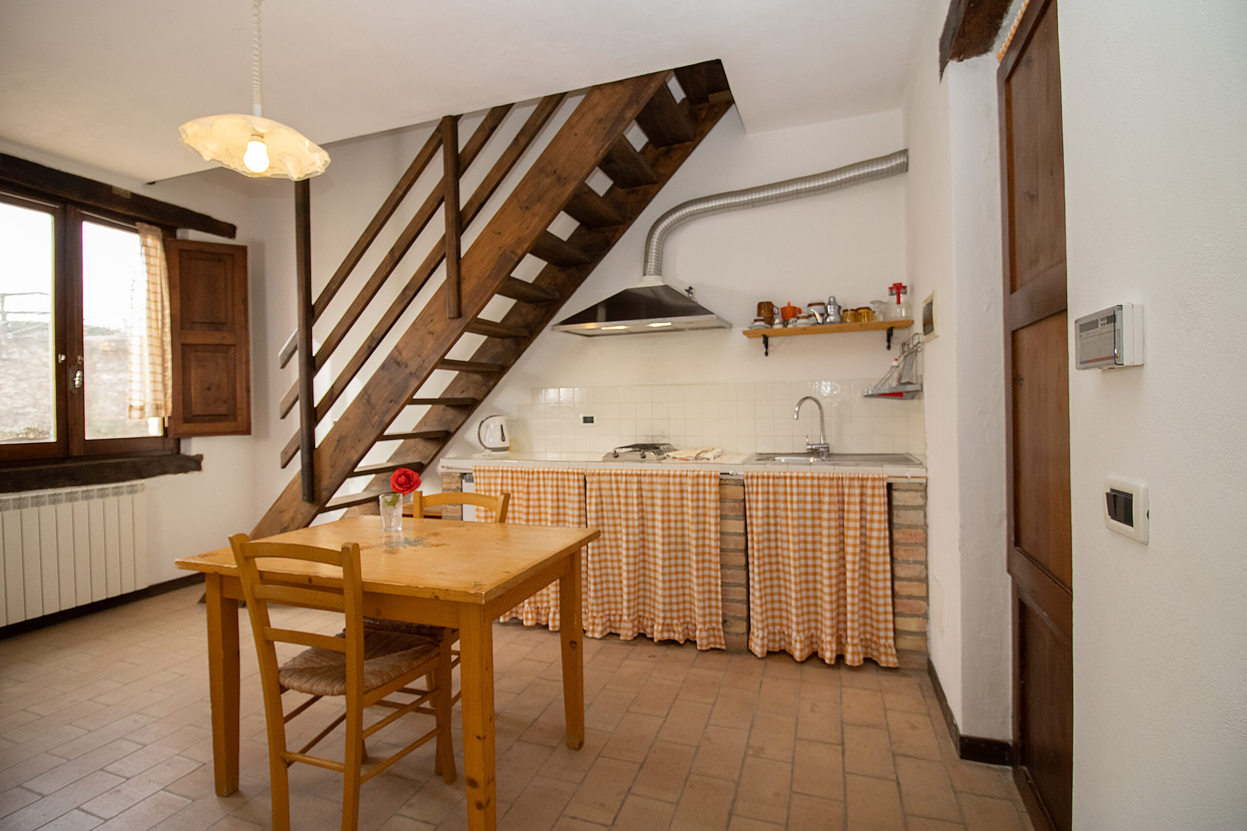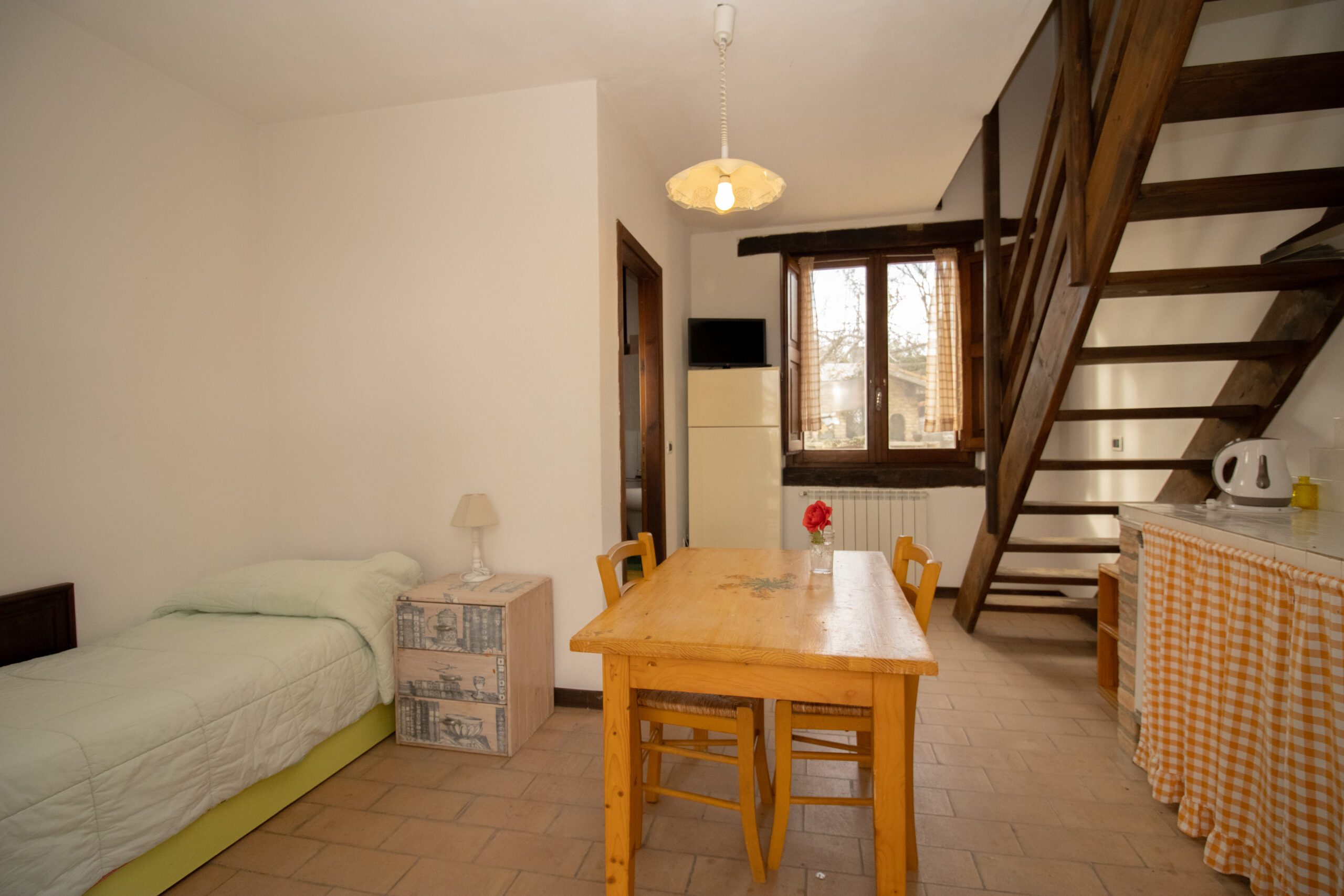 En el antiguo establo hay tres apartamentos de dos habitaciones, cada uno en dos niveles: El Rojo, el Verde y el Amarillo. En la planta baja, cada apartamento tiene un cuarto de baño con ducha, una cocina americana y 1 ó 2 camas individuales. En la planta superior hay una cama doble, con la posibilidad de añadir una cama individual. En el exterior hay un porche sombreado de 60 m² con mesa y sillas.